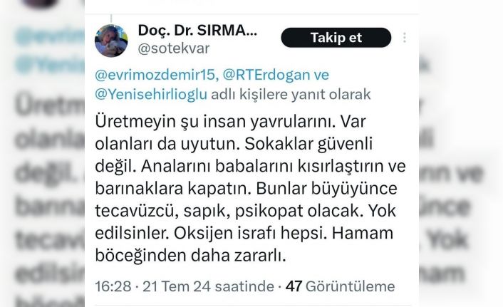 Ankara Üniversitesi İletişim Fakültesi’nde akademisyen olarak görev yapan Doç. Dr. Sırma Oya Tekvar’ın sosyal medya hesabı üzerinden çocukları hedef alan sözleri ortaya çıktı. Tekvar’ın sosyal medya hesabından çocuklara yönelik olarak, "Üretmeyin şu insan yavrularını, var olanları da uyutun" dedi. Tekvar’ın düzenli olarak hayvan hakları savunması adı altında, çocukları hedef aldığı paylaşımlarda bulunduğu ortaya çıktı. Tekvar, sokak hayvanları ile alakalı çıkan kanunun ardından, "Hayvanlara biçtiğiniz kader, çocuğunuzun kaderi olsun" dedi. Ayrıca Üniversite’de akademisyen olarak görev yapan Tekvar öğrencileri hedef alarak, "O arsız, edepsiz, histerik çocukların psikolojisini bozarken aldığım hazzı anlatamam. Gayet de çocuk sevmiyorum" dediği ortaya çıktı. Tekvar’ın sosyal medyadan yaptığı paylaşımlarına vatandaşlardan tepki geldi.
