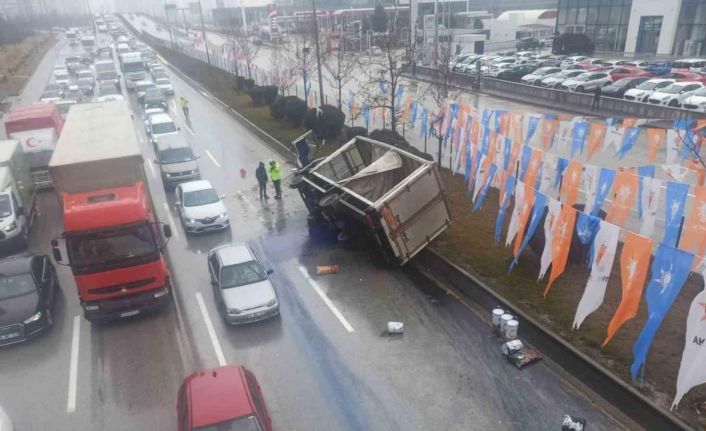 Olay, Ankara’nın Sincan ilçesinde sabah saatlerinde meydana geldi. Ayaş yolu istikametinden seyir halinde olan 07 FJ 694 plakalı boya yüklü kamyon, 06 SGG 39 plakalı tıra arkadan çarptı. Çarpışmanın etkisiyle boya yüklü kamyon devrildi. Devrilen kamyonun içerisindeki boya ise yola saçıldı.