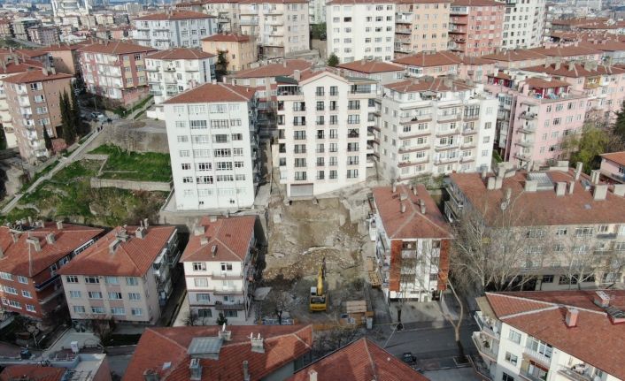 Başkentte boş arazide yapılan inşaat çalışmaları nedeniyle bir üst paralelde bulunan Açelya Apartmanı’nın temelinde kayma oluşurken, olay yeri havadan görüntülendi.