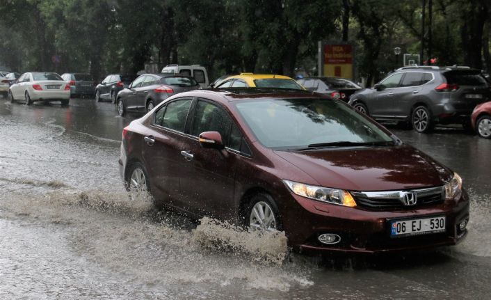 Ankara’da öğle saatlerinde aniden bastıran sağanak yağmur hayatı olumsuz etkilerken, birçok binanın bordum katlarını su bastı.