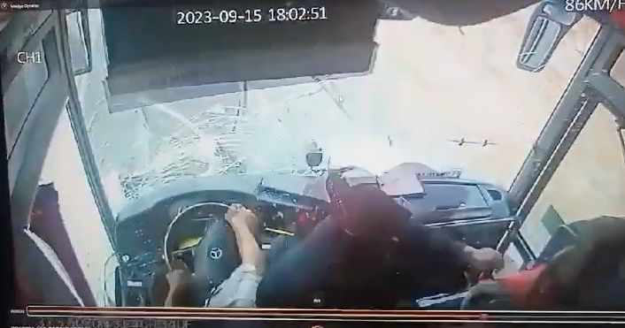 Kaza anı yolcu otobüsünde bulunan güvenlik kamerasına da saniye saniye yansıdı. Otobüsün kendi şeridinde ilerlediği anlarda otomobilin bir anda otobüsün önüne çıkması ve altına girmesi saniye saniye kaydedildi. Çarpmanın etkisiyle ön koltukta oturan bir kadın yolcunun yerinden savrularak şoförün yanına düştüğü anlar da kayda girdi. Şoförün bir yandan otobüsü kontrol etmeye çalışıp, bir yandan da üzerine doğru gelen kadını koluyla durdurmaya çalıştığı görüldü.