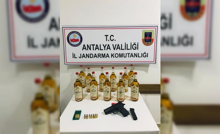 Manavgat Cumhuriyet Başsavcılığı koordinesinde, dün saat 18.00 sıralarında Antalya İl Jandarma Komutanlığı KOM Şube Müdürlüğü ve Manavgat KOM Şube Müdürlüğü ekiplerince yapılan istihbarı çalışma sonucunda, Yayla Mahallesi’nde yaşayan C.D’nin evinde arama yapıldı. Aramada, 1 adet el yapımı, 9x19 mm tabanca ve 11 şişe 100 cc’lik kaçak viski ele geçirildi. Şüpheli, Manavgat Cumhuriyet Başsavcılığı talimatı ile ifadesinin alınmasının ardından serbest bırakıldı.