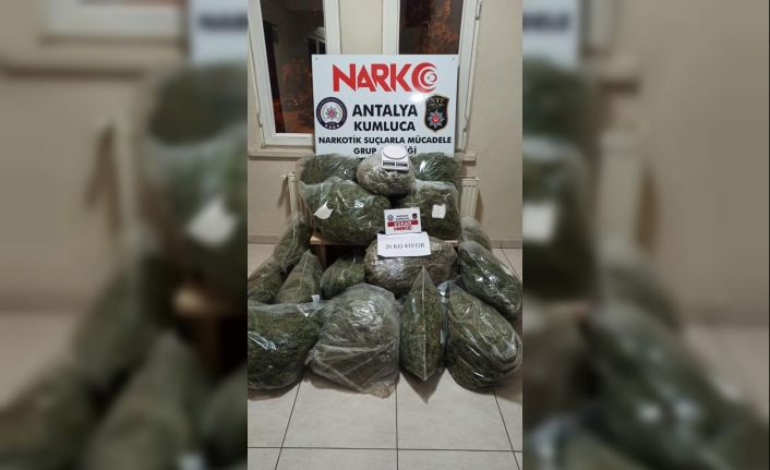 Edinilen bilgiye göre, Kumluca İlçe Emniyet Müdürlüğü Narkotik Suçlarla Mücadele Grup Amirliği uyuşturucu madde ticareti yapan şahıs ve gruplara yönelik olarak çalışma başlattı. Yapılan çalışmalar neticesinde tespit edilen adreslere operasyon yapılarak 18 parça halinde çuval ve şeffaf poşetlere sarılı 26 kilo 410 gram esrar maddesi ile uyuşturucu tartımında kullanılan 1 adet hassas terazi ele geçirildi.