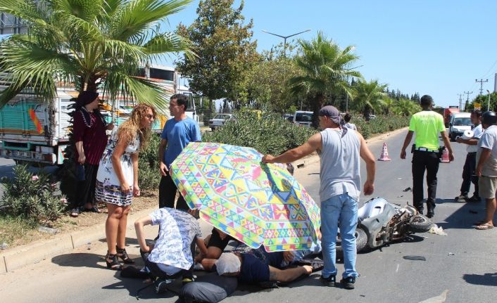 Antalya’da motosiklet kazasında yaralanan sürücüyü vatandaşlar, sıcaktan plaj şemsiyesi ile korudu.