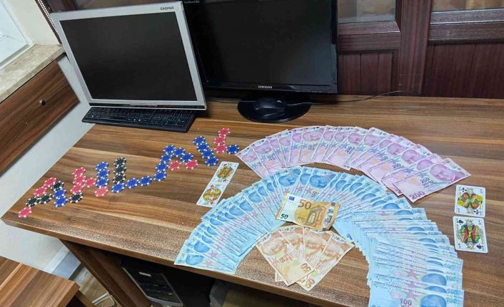 Antalya’da ‘kumar’ oynatılan işyerine düzenlenen operasyonda 46 adet poker pulu, 52 adet iskambil kağıdı, 10 bin 800 TL ve 50 euro para ele geçirildi.