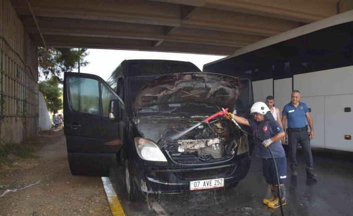 Antalya’nın Aksu ilçesinde turistleri taşıyan tur minibüsünün motor bölümü, seyir halindeyken yanmaya başladı. Yanan minibüs itfaiyenin müdahalesiyle söndürüldü.