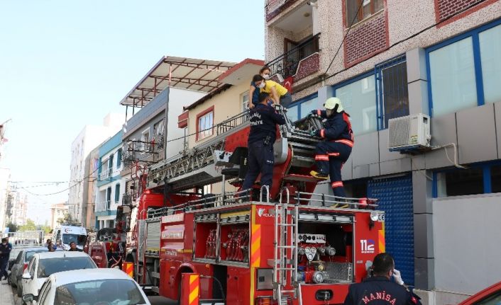 Manisa’nın Yunusemre ilçesinde bir apartmanın merdiven boşluğunda çıkan yangın paniğe neden olurken, kısa sürede olay yerine gelen itfaiye ekipleri binanın üst katında mahsur kalan vatandaşları merdivenle tahliye etti.