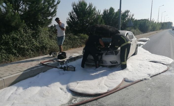 Edinilen bilgiye göre, Antalya-Alanya D-400 Karayolu’nda Antalya istikametinden Alanya istikametine seyir halindeki D.G.’nin kullandığı otomobil, Sanayi Köprülü Kavşak yan yolda, kum yolu kavşağındaki trafik lambalarında bekledikten sonra hareket ettiği sırada yanmaya başladı. Aracın göstergesindeki uyarı üzerine aracı sağa çeken araç sürücüsü ve yanında bulunan arkadaşı araçtan inerken, aracın yandığını gören araç sürücüleri yangın tüpleriyle müdahalede bulundu. Antalya Büyükşehir Belediyesi Manavgat Birimine bağlı itfaiye ekibinin de ihbar üzerine olay yerine gelerek müdahalede bulunması sonucunda yangın söndürüldü. Aracın motor bölümünde büyük hasar oluştu.