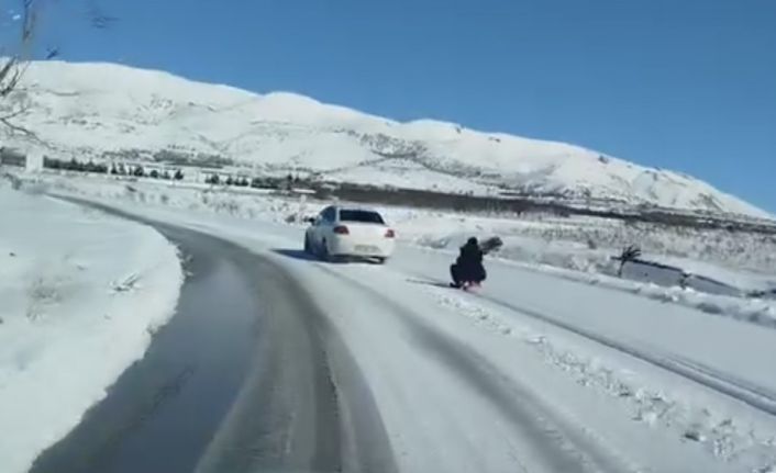 Elazığ’da bir şahıs, aracına bağladığı kızağı metrelerce çekti. Tehlikeli eğlence kameralara yansıdı.