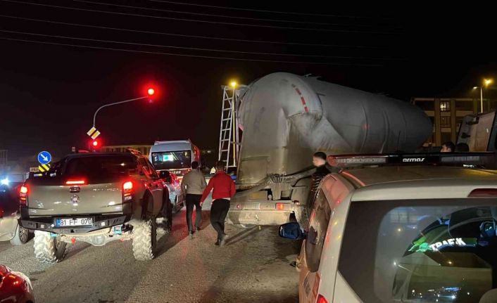 Düzce’de ışıklarda bekleyen araçlara çarpmamak için manevra yapan çimento yüklü tır kaldırımda asılı kaldı.