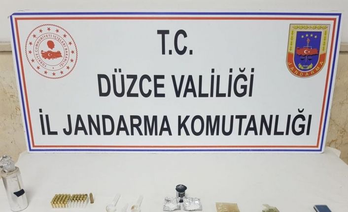 İl Jandarma Komutanlığı ekipleri, Düzce Merkeze bağlı Kemerkasım köyünde N.İ. isimli şahsın uyuşturucu madde ticareti yaptığı bilgisini elde etti. Bunun üzerine ekipler, Kemerkasım köy yolu üzerinde içeresinde M.İ. ve P.C.’nin bulunduğu aracı durdurarak KOM şube narkotik arama köpeği ile birlikte arama yaptı. Yapılan aramada araç içinde 3 gram metamfetamin, 3 gram kubar esrar, 40 tabanca fişeği, 1 hassas terazi ve 2 metamfetamin kullanma aparatı ele geçirildi. Şahsın evinde yapılan adli aramada da, 3 gram eroin yakalandı. Şüpheli N. İ. ve P. C., ’uyuşturucu madde imal ve ticareti’ suçundan gözaltına alındı. Olayla ilgili adli tahkikat sürüyor.