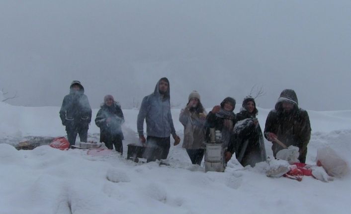 Karla kaplı geçitte karlar üzerinde mangal ve çay keyfi yaparken piknik yapan vatandaşlara, çocuklar ise kartopu oynayarak eşlik etti.