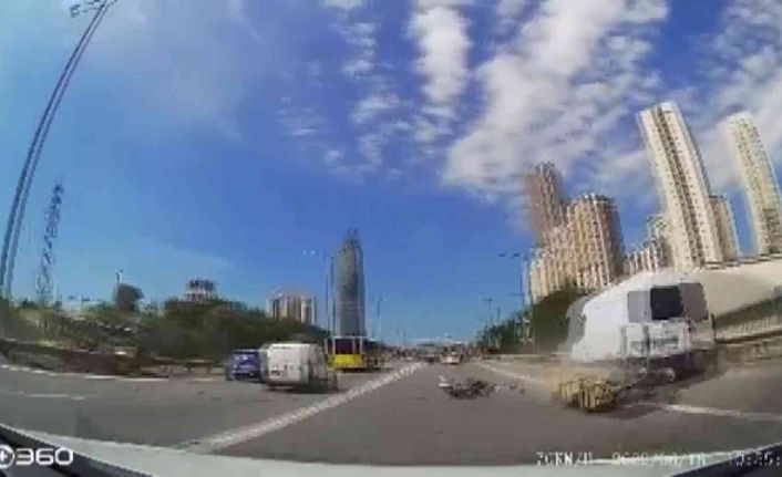 Ataşehir’de emniyet şeridinde hızla ilerleyen motosiklet sürücüsü, direksiyon hakimiyetini kaybederek yol kenarında park halinde bulunan servis aracına çarptı. Motosiklet sürücüsü, çarpmanın etkisiyle yola savruldu. Sürücü o esnada yoldan geçen bir başka aracın altında kalmaktan son anda kurtuldu. Yaşanan kaza anı araç kamerasına yansıdı.