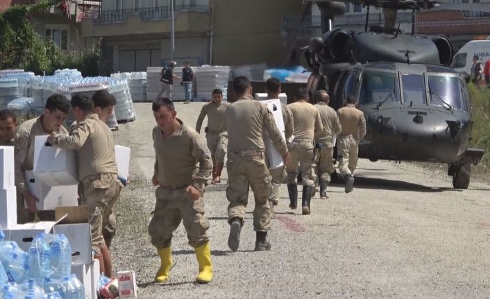 Jandarma komandolar gelen erzak yardımlarını yıkık köprüden gönüllülerle oluşturulan insan zinciri ile geçiriyor, su basan Ayancık Devlet Hastanesi’nin de temizliğini yapıyor. Hastanedeki çamura bulanan eşyaları dışarı çıkaran jandarmalar, kirlenen bölgeleri su ve deterjanla yıkıyor. Ellerinde küreklerle ihtiyaç olan yerlere koşturan jandarma, ayrıca helikopterlerle insanları kurtarmaya devam ediyor. Jandarma personeli helikopterlere de yardım malzemeleri taşıyarak, ihtiyaç sahibi bölgelere aktarılmasını sağlıyor.Ayancık’ta Mehmetçik vatandaşın yaralarını sarıyor