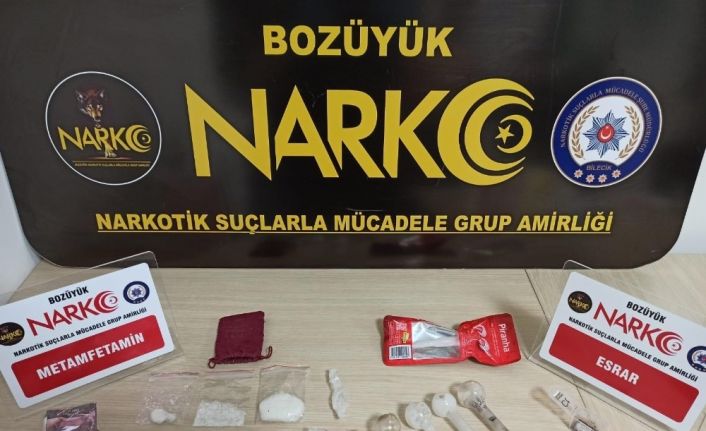 Bozüyük İlçe Emniyet Müdürlüğüne bağlı Narkotik Suçlarla Mücadele Grup Amirliği ekipleri, uyuşturucu madde kullanan, ticaretini yapan şahıs ve organizasyonların deşifresine yönelik çalışma kapsamında Bursa-Bozüyük gelişi ilçe girişinde ilçeye uyuşturucu madde sokmaya çalıştığı bilgisini aldıkları aracı durdurdu. Araçta yapılan aramada 23,13 gram metamfetamin, 5,28 gram toz esrar ve 4 adet cam aparat ele geçirilirken, Z.Ç., M.A., N.Y. ve I.E. gözaltına alındı.