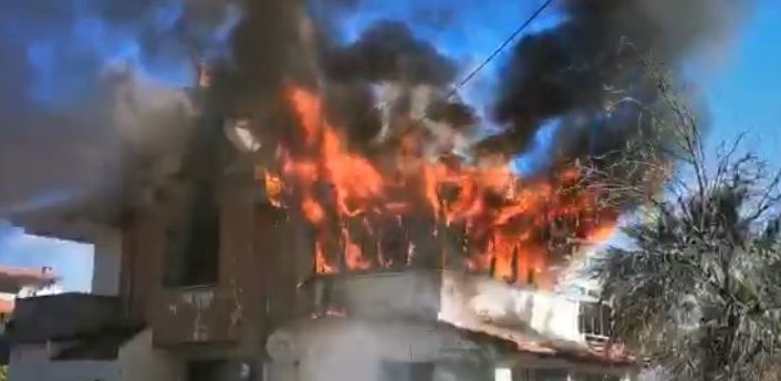 Balıkesir’in Ayvalık ilçesinde bir tripleks villada çıkan yangında ev sahiplerine ait iki köpek dumanlardan etkilenerek telef oldu. Yanan binanın alevler içindeki hali amatör kameralar tarafından saniye saniye görüntülendi.