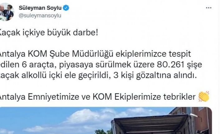 İçişleri Bakanı Süleyman Soylu, sosyal medya hesabından Antalya’daki kaçak içki operasyonu başarısını paylaşarak “Kaçak içkiye büyük darbe” sözlerini kullandı.