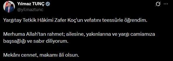 Adalet Bakanı Yılmaz Tunç, Yargıtay Tetkik Hakimi Zafer Koç için başsağlığı mesajı yayımladı.