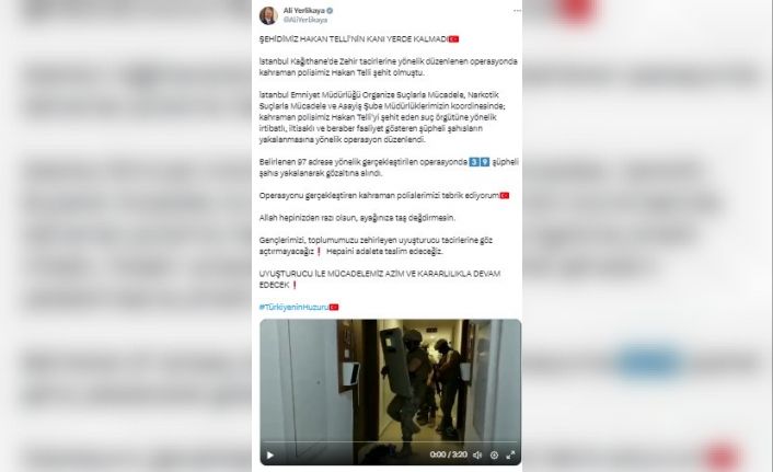 İçişleri Bakanı Ali Yerlikaya, İstanbul Kağıthane’de zehir tacirlerine yönelik düzenlenen operasyonda şehit olan polis memuru Hakan Telli’nin intikamının alındığını açıkladı. Bakan Yerlikaya, sosyal medya hesabından yaptığı paylaşımda, “Belirlenen 97 adrese yönelik gerçekleştirilen operasyonda 39 şüpheli şahıs yakalanarak gözaltına alındı. Operasyonu gerçekleştiren kahraman polislerimizi tebrik ediyorum. Allah hepinizden razı olsun, ayağınıza taş değdirmesin. Gençlerimizi, toplumumuzu zehirleyen uyuşturucu tacirlerine göz açtırmayacağız. Hepsini adalete teslim edeceğiz. Uyuşturucu ile mücadelemiz azim ve kararlılıkla devam edecek” ifadelerine yer verdi.