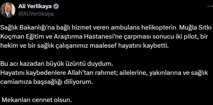 “Sağlık Bakanlığı’na bağlı hizmet veren ambulans helikopterin Muğla Sıtkı Koçman Eğitim ve Araştırma Hastanesi’ne çarpması sonucu iki pilot, bir hekim ve bir sağlık çalışanımız maalesef hayatını kaybetti. Bu acı kazadan büyük üzüntü duydum. Hayatını kaybedenlere Allah’tan rahmet; ailelerine, yakınlarına ve sağlık camiamıza başsağlığı diliyorum. Mekanları cennet olsun.”
