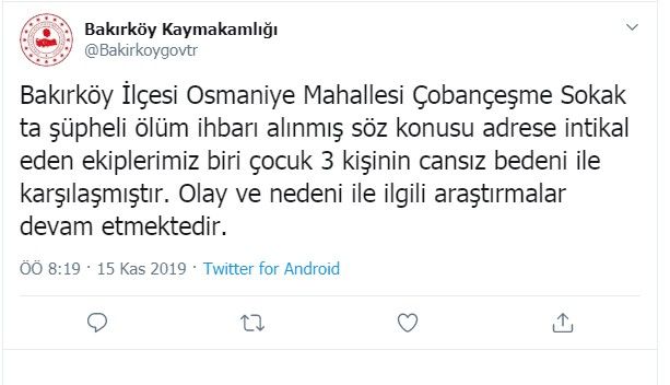 Kaymakamlığın sosyal medya hesabından yapılan açıklamada şu ifadeler kullanıldı: “Bakırköy ilçesi Osmaniye Mahallesi Çobançeşme Sokak’ta şüpheli ölüm ihbarı alınmış, söz konusu adrese intikal eden ekiplerimiz biri çocuk 3 kişinin cansız bedeni ile karşılaşmıştır. Olay ve nedeni ile ilgili araştırmalar devam etmektedir.”