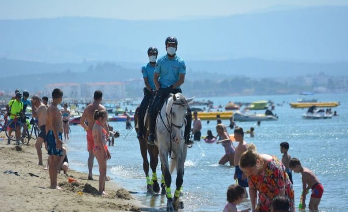 Sahil bölgesinde özel eğitimli atları ile devriye gezen jandarma atlı timleri turistlerden büyük ilgi görüyor. Birçok turist atlı timler ile fotoğraf çektirdi.
