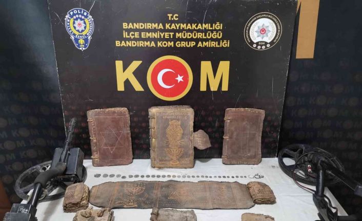 Balıkesir ve Bandırma’da Emniyet Müdürlüğü’ne bağlı KOM ekipleri ayrı ayrı yaptıkları tarihi eser operasyonlarında 8 adet İbranice yazılı dini motifli kitap ile 1 adet deri üzerine yazılmış parşömen çok sayıda tarihi sikke, obje, çok sayıda tarihi eser ele geçirdi. Operasyonlarda 6 kişi yakalandı.