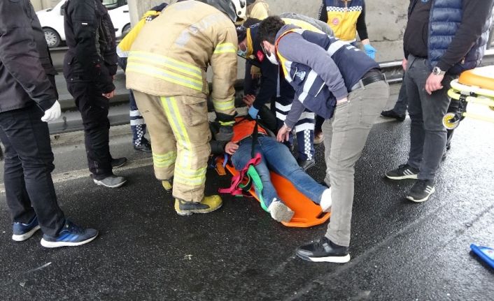 İstanbul E-5 karayolu Halıcıoğlu mevkisinde hafif ticari aracın sıkıştırdığı iddia edilen otomobil bariyerlere çarptı. Bariyere çarpan araçta yangın çıkarken yaralı sürücü son anda kurtarıldı.