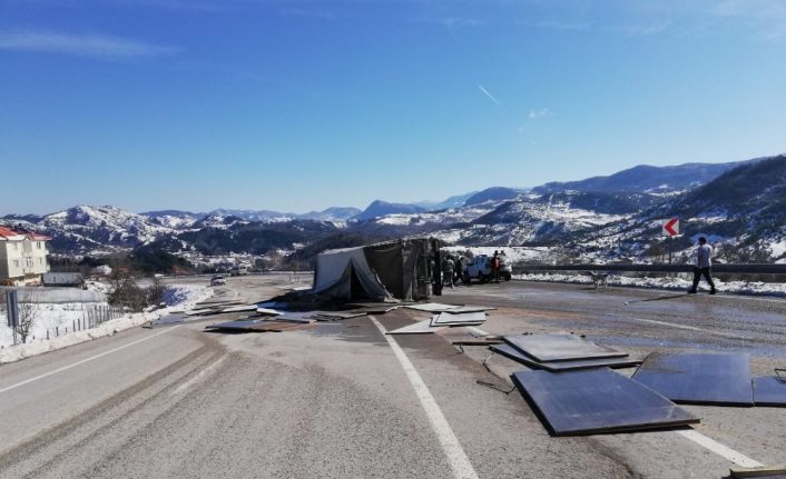 Bartın’da freni patlayan MDF yüklü kamyon devrildi