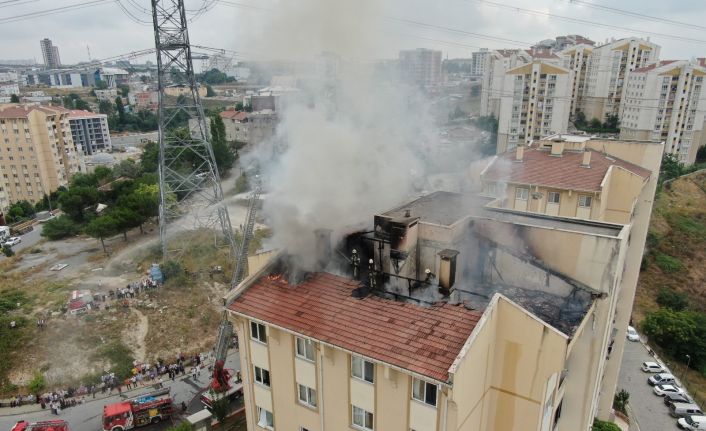 Başakşehir’de, 13 katlı binanın elektrik panolarından yangın çıktı. Elektrik kablolarını saran yangın bina boşluğundan çatıya sıçradı, çatı alev alev yandı. Binada mahsur kalanları itfaiye tahliye ederken, 2 kişi dumandan etkilendi. Söndürme çalışmasının yapıldığı çatı havadan görüntülendi.