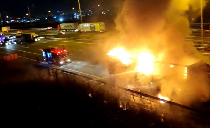 Başakşehir’de seyir halindeki plastik ve kumaş yüklü bir tırın dorsesi alev alev yandı. Yangın itfaiye ekiplerinin müdahalesiyle söndürüldü.