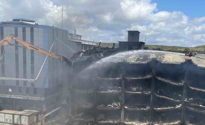 Başakşehir’de, bulunan 6 katlı bir iş hanında çıkan yangını soğutma çalışmaları 3’üncü gününde devam ederken, binanın yıkımına başlandı.
