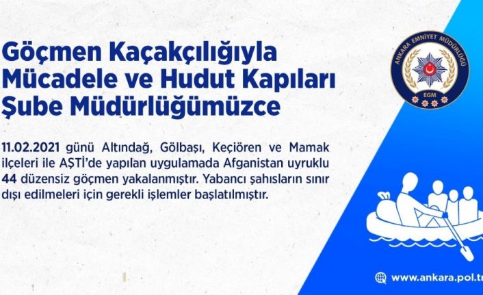 Ankara Emniyet Müdürlüğü Göçmen Kaçakçılığıyla Mücadele ve Hudut Kapıları Şube Müdürlüğü ekipleri tarafından Altındağ, Gölbaşı, Keçiören ve Mamak ilçeleri ile Ankara Şehirlerarası Terminal İşletmesi’nde (AŞTİ) gerçekleştirilen uygulamalarda Afganistan uyruklu 44 düzensiz göçmen yakalandı. Yakalanan şahısların sınır dışı edilmesi için gereken işlemlerin başlatıldığı kaydedildi.