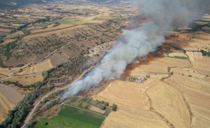 Ankara’nın Kahramankazan ilçesinde bir tarlada çıkan yangın korkuttu. Yangın havadan görüntülendi.