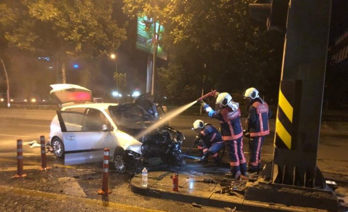 Ankara’nın Çankaya ilçesinde sürücüsünün hakimiyetini kaybetmesi sonucu yön levhasına çarpan otomobil alev aldı.
