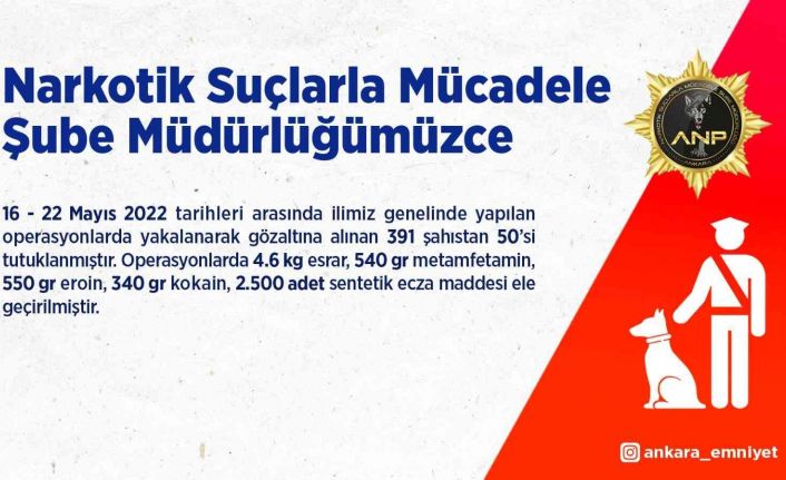 Ankara Emniyet Müdürlüğü Narkotik Suçlarla Mücadele Şube Müdürlüğü ekiplerince 16-22 Mayıs tarihlerinde Ankara geneli uyuşturucu madde ticaretinde bulunduğu tespit edilen şahıslara operasyon düzenlendi. Gerçekleşen operasyonlarda gözaltına alınan 391 şahıstan 50’si tutuklanırken yapılan aramalarda 4 bin 600 gram esrar, 540 gram metamfetamin, 550 gram eroin, 340 gram kokain, 2 bin 500 adet sentetik ecza maddesi ele geçirildi.