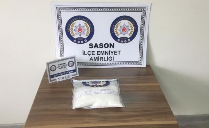 Edinilen bilgilere göre, Batman İl Emniyet Müdürlüğü Sason İlçe Emniyet Amirliği ekipleri, "torbacı" olarak tabir edilen uyuşturucu satıcılarına yönelik yaptığı çalışmalarda, çevre illerden, ilçeye uyuşturucu madde girişi olduğunu tespit etti. Bu doğrultuda çalışmalarını yoğunlaştıran polis ekipleri, dün sabah saatlerinde narkotik detektör köpekleriyle birlikte, Sason ilçesine bağlı Mehmet Akif Mahallesinde bir adreste yaptığı şok baskında piyasa değeri yaklaşık 250 bin lira değerinde olan 510 gram ağırlığında metamfetamin uyuşturucu maddesi ele geçirdi.