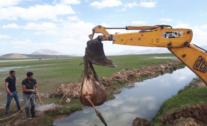 Van’ın Çaldıran ilçesinde merada otlarken düştüğü çayda beli kırılan ineğin imdadına Çaldıran Belediyesi ekipleri yetişti.