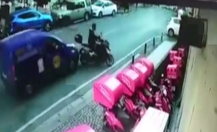 Beşiktaş’ta cadde üzerinde “U” dönüşü yapan motosikletli kuryeye seyir halinde olan hafif ticari araç çarptı. Kaza anı kameralara yansırken, demir dubalara çarpan sürücü hafif şekilde yaralandı.