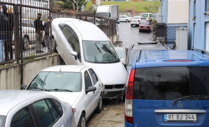 Beylikdüzü’nde sanayi sitesi girişinde trafik kazasına karışan otomobil, yol kenarında bulunan otoparktaki araçların üzerine uçtu. 6 aracın hasar gördüğü kaza güvenlik kamerası tarafından saniye saniye kaydedildi.