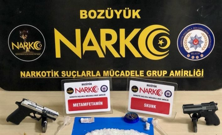 Bilecik Narkotik Suçlarla Mücadele Şube Müdürlüğü ve Bozüyük Narkotik Suçlarla Mücadele Grup Amirliği görevlileri, ilçede Muğla plakalı bir araçtan şüphelendiler. Durdurulan araç içinde piyasa değeri 275 bin olan 1 kilogram metamfetamin maddesi, 2 adet uyuşturucu madde kullanımına yarayan bong aparatı, 6 adet uyuşturucu madde kullanımına yarayan bong aparatı yapımında kullanılan cam aparat, 21.41 gram ağırlığında uyuşturucu öğütmeye yarayan değirmen tabir edilen düzenek içerisinde uyuşturucu maddelerden skank maddesi, 0.73 gram uyuşturucu maddelerden esrar maddesi, 2 adet tabanca, tabancalara ait 2 adet şarjör ve 10 adet tabanca fişeği ele geçirildi.
