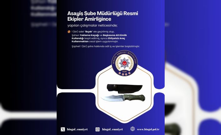 Bingöl Emniyet Müdürlüğü Asayiş Şube Müdürlüğü ekiplerince uygulama gerçekleştirildi. Uygulamada yapılan aramalarda, yakalama kaçağı olarak aranan şahıs, üzerinde bıçakla, başkasına ait kimlikle, ehliyetsiz araç kullanırken yakalandı. Şahıs hakkında adli ve idari işlemlere başlandığı belirtildi.