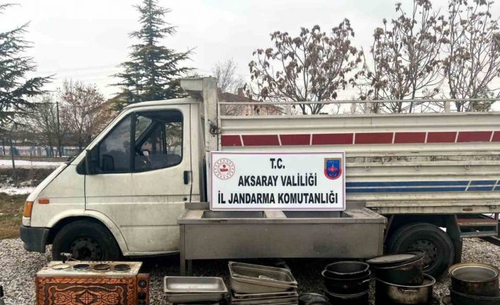 Edinilen bilgiye göre, Aksaray’da rutin yol kontrolü yapan İl Jandarma Komutanlığı ekipleri, şüphe üzerine bir kamyoneti durdurdu. Sürücü M.K. ve yanında yolcu olarak bulunan A.Y. isimli şahısların tedirgin hal ve hareketlerinden şüphelenen jandarma ekipleri, şahısların üzerinde arama yaptı. Şahısların sorgulamasını da yapan dedektifler, M.K. ve A.Y.’nin hırsızlık suçundan kayıtlarının olduğu tespit etti. Bunun üzerine jandarma ekipleri, kamyonette yaptığı aramada, birçok mutfak malzemesi buldu. Malzemelerin çalıntı olabileceği ihtimali üzerine olaya Jandarma Suç Araştırma Timi (JASAT) dedektifleri müdahale etti. JASAT dedektifleri şahıslar üzerinde ve geldikleri istikamette yaptığı araştırmada kamyonette bulunan mutfak malzemelerinin yol üzerinde bulunan bir dinlenme tesisinden çalındığını tespit etti. Bunun üzerine 2 şüpheli gözaltına alınarak, sorgulanmak üzere İl Jandarma Komutanlığına götürüldü. Ele geçirilen 1 adet piknik tüpü, 1 adet elektrikli çay semaveri, 30 adet endüstriyel tip yemek küveti, 8 adet küçük boy sac tava, 8 adet çelik tencere, 1 adet endüstriyel tip iki gözlü bulaşık yıkama tezgahı, 2 adet kulpsuz tava ve 4 adet alüminyum tencere tesis yetkililerine eksiksiz olarak teslim edildi. Gözaltına alınan 2 şüphelinin jandarmadaki işlemlerinin ardından adli makamlara sevk edileceği öğrenildi.