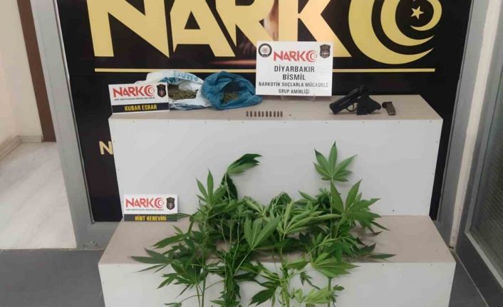 Bismil İlçe Emniyet Müdürlüğü Narkotik Suçlarla Mücadele Büro Amirliği ekiplerince yapılan çalışmalar neticesinde kimlik ve adres bilgileri tespit edilen A.A. ve C.Ö. isimli şüphelilerin ikametlerinde yapılan aramada 7 kök kenevir bitkisi, yaklaşık 70 gram narkotik madde ve 1 adet ruhsatsız tabanca ele geçirildi.