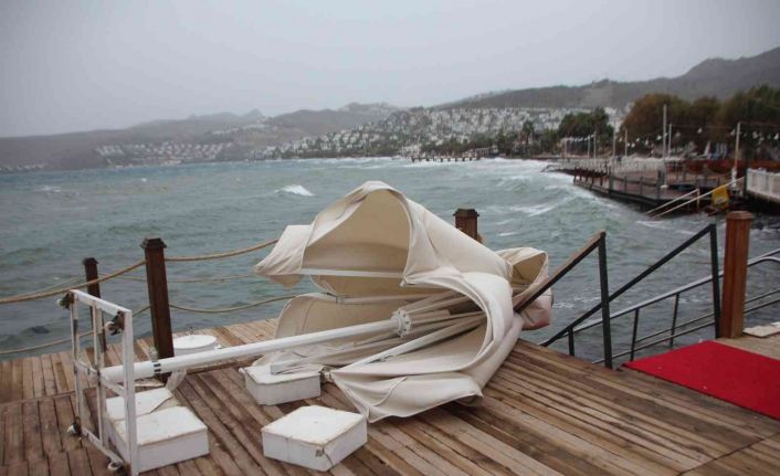 Muğla’nın Bodrum ilçesinde hızı 80 kilometreye kadar ulaşan fırtınada ağaçlar yıkıldı, direkler devrildi, elektrik telleri koptu.