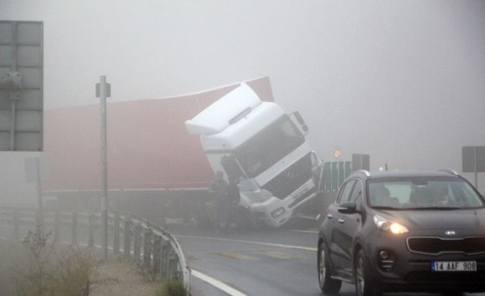 Bolu’da, yoğun sisin etkili olduğu D100 karayolu Bolu Dağı kesiminde kontrolden çıkan tır, refüjde bulunan beton bariyerlerin üzerine çıkarak asılı kaldı.