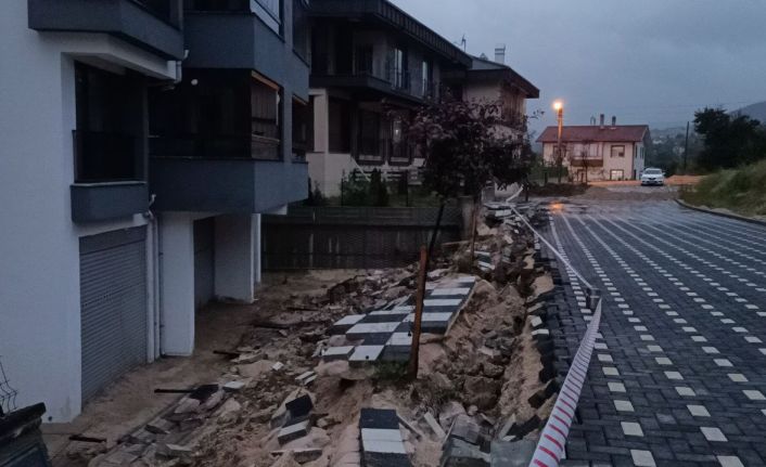 Bolu’da etkili olan sağanak nedeniyle taşan derelerin suyu bir apartmanın istinat duvarını çökertti.