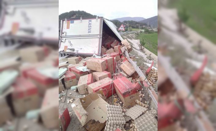 Bolu’da kontrolden çıkan yumurta yüklü tır devrildi. Kazada sürücü yaralanırken, tırın dorsesindeki yüzlerce yumurta kolisi yola saçıldı.
