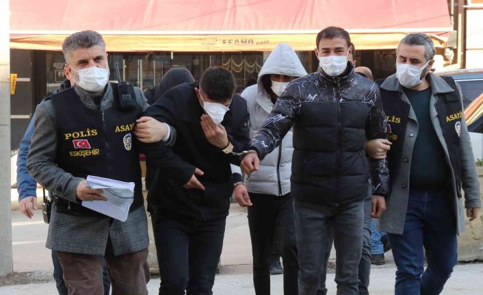 Eskişehir’de bir büfeden hırsızlık yaptıkları belirlenen 5 şahıstan 4’ü tutuklandı. Şüphelilerden birinin adliyeye götürülürken yüzünü maskeyle kapatmaya çalışması dikkat çekti.