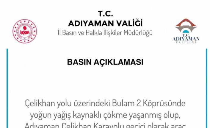 Konu ile ilgili Adıyaman Valiliğinden yapılan açıklamada, "Çelikhan yolu üzerinde bulunan Bulam-2 köprüsünde yoğun yağış kaynaklı çökme yaşanmış olup Adıyaman-Çelikhan karayolu geçici olarak araç trafiğine kapatılmıştır. Karayolları Bölge Müdürlüğünün çalışmaları devam etmektedir" ifadelerine yer verildi.